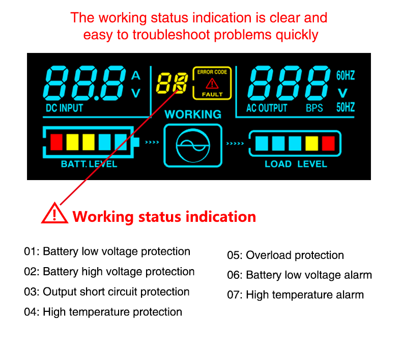 5. LCD displays working parameters, alarms and fault codes, the working status is clear to users (BBP1000 and BBP1500 are not with this function);